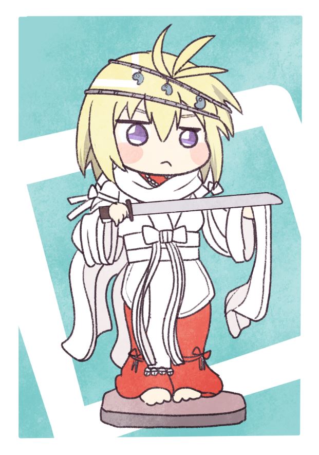 「やられる前にやってやるッショ!」なやる気元気クシナダでショウさんだと思っていたら、戦いに使った天羽々斬が、オロチの尾から出てきた草薙剣にぶつかって欠けちゃったのをじっと見つめる姿とのこと。