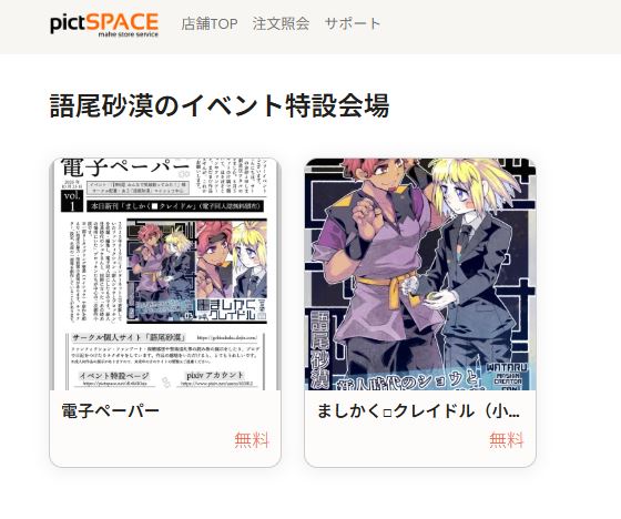 サークル「語尾砂漠」の特設会場、本日23:00までです