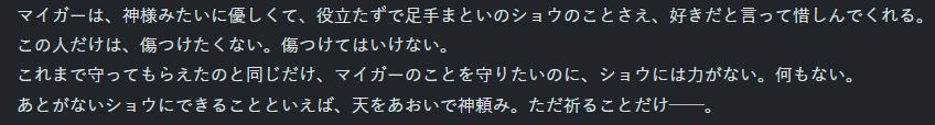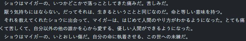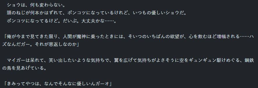 トンチキ作戦考案できるくらいまだ全然すさんでなくて、生身では守りに徹してそれで事足りているショウさんは、やっぱりずっと隣の暴力担当マイガーさんに、優しい心を守られ続けているんではないかなあ