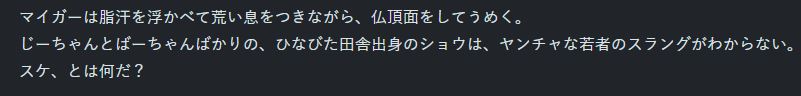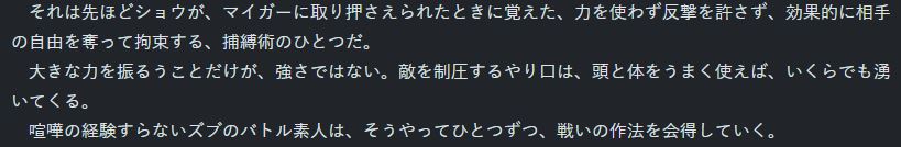 戦闘経験0の村人Sを、武器を持たせないまま自分の身を守れるように、敵を無力化できるように仕込むとしたら、そういうのを仕込むんじゃないでしょうかねえと妄想しつつ、いっぱい生身で体術教えてもらう(=自分の体で試されて痛みで覚える)ショウさんよいですなあと思います、きっと毎回床をたたいてギブギブと泣いている