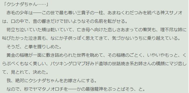 クシナダちゃんとスサノオ様のこといっぱい書きたいんですけど、「これは…なんだろう…?」とちょっとお外で人に見せるの、元気いっぱいすぎてはずかしいので