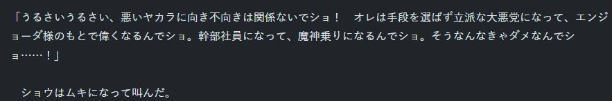 (とくにショウさんの身振りの大きい「チャンスでショーウ!」のサウンドオブミュージックみたいなポーズ見ると、子供をノセるのが得意な(たくさん子供と遊んで、子供がのってくれるごっこ遊びの設定を考えるのに慣れてる)年長のお兄さんしぐさな感じあって、「子供の相手が得意」というスキル持ちの元一般村人のふつうのお兄さんだから、救世主を利用する計画に抜擢された可能性もあるのかも、ほかのヤカラたちどう見ても子供うけよろしくなさそうですし、強面で話術うまくないマイガーさんひとりでは、この仕事絶対無理だと思う)